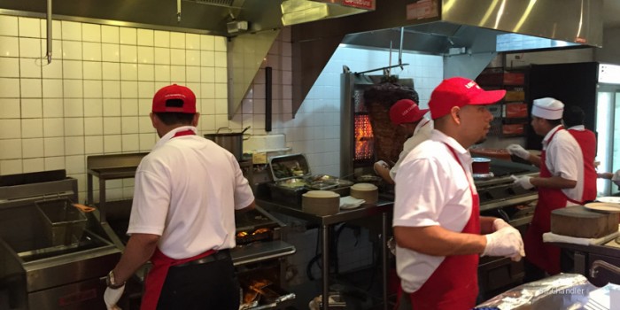 Todos los cocineros hablan español y el que nos tocó a nosotros era macanudo. Preparó rápido el pedido y lo personalizamos ahí. Me miró raro cuando le dije sin picante… y me dijo «no es muy picante». Entonces cedí…