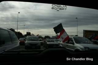 Camino a Ezeiza, sobre la autopista se notaban muchos autos «decorados»… pero al llegar al aeropuerto mismo la cosa cambió mucho… eran pocos los que no tenian los colores del pincha!