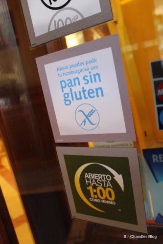 Pero pasando por otro en otro local de la madre patria, encontré esta calco en la entrada que indica que tienen panes sin gluten, lo que permite que un celiaco pueda volver a comer una hamburguesa en pan…