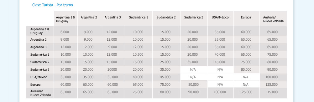 No hablan sobre la obtención de puntos, pero esto sería lo lógico de cada destino. Si a Bariloche hay 1.600 km de ida en auto… quizás… y digo quizás, sean 1.200 km en línea recta… si fuera así, serían 745 millas por tramo.
