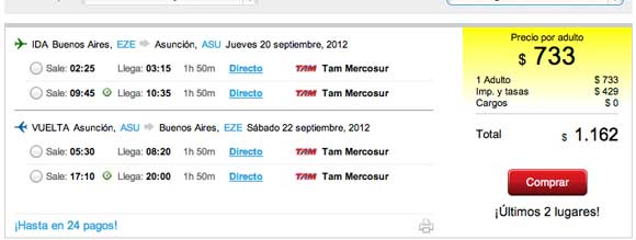 O sea que esos 450 puntos significan un ahorro de casi $200. La ventaja igual que veo es la posibilidad de las cuotas, que con TAM directo o con Despegar. Obvio 36 cuotas para un pasaje así es al divino botón, pero había desde 3 en las opciones.
