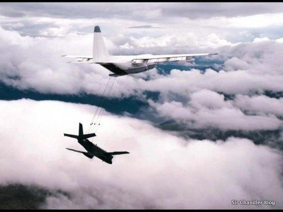 Esa escena increíble donde desde un Hércules C130 «enganchan» a un «avioncito» negro es impresionante.