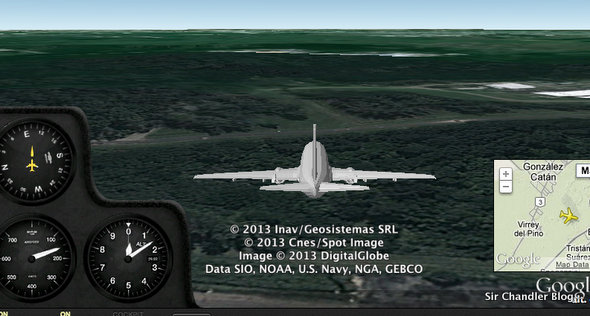 Pero abajo de todo está el botón «Cockpit view», que al presionarlo deja de mostra la visión de mapa habitual, para pasar a hacerlo desde la cabina… hace falta tener el complemento de Google Earth 3D, pero es muy fácil instalarlo.