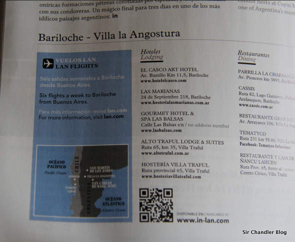 Pero por el otro, el que edita la revista está atentando contra LAN en si, porque da un dato pésimo y que no va con la realidad «Seis salidas semanas a Bariloche desde Buenos Aires»