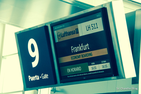 Lunes 6 de octubre. 13:30 horas. Este cartel me indicaba que era temprano. Mi vuelo salía a las 16:55 rumbo a Frankfurt, Alemania.