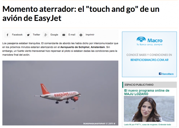 Sin dejar de reconocer las burradas expuestas en los ejemplo y siendo un poco mas quisquilloso, creo que entre los dos casos hay una gran diferencia: En el caso del A380 se trata de una noticia sobre un incidente que trajo alguna consecuencia. En el caso del A320 de EasyJet convirtieron en noticia algo que no lo es. Un aterrizaje abortado es algo bastante habitual, sobre todo en algunos aeropuertos y no merece ningún tipo de difusión. El video en que está basada la no-noticia fue realizado por un spotter, persona a la que si le interesa «pescar» este tipo de situaciones. Incluso cuando uno en youtube mira un video asi, YT sugiere videos similares, por lo que uno podría pasarse horas viendo aterrizajes abortados y otros #momentosdepanico
