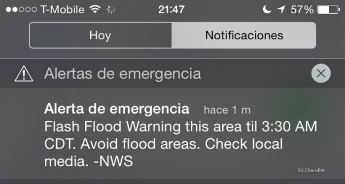 Las alertas meteorológicas en USA son excelentes. Igualmente lo ideal para cuando estas en zonas de probables condiciones severas meteorológicas es seguir a la oficina de pronóstico local por Twitter (NWS). Lo super recomiendo, especialmente si vas en época de tornados donde no tenés mucho tiempo si te llega un Tornado Warning. Igualmente si la situación es potencialmente severa la televisión también es la mejor aliada. Si no la seguian por ahi es porque no era tan importante.