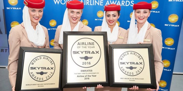 Emirates fue reconocida como la Mejor Línea Aérea del mundo en los prestigiosos Skytrax World Airline Awards 2016, además de haber recibido premios como Mejor Aerolínea de Medio Oriente y, por doceavo año consecutivo, el premio al Mejor Sistema de Entretenimiento a bordo.