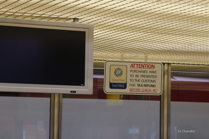 El mostrador no abrió hasta dos horas antes si mal no recuerdo. Y vi este cartel donde recordaba que habia que hacer el sellado de tax free antes del checkin. Yo ya lo había hecho como mostré en este post.