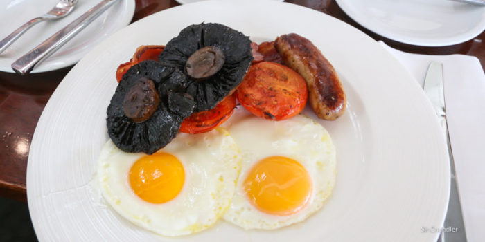 Hasta las 11am se podía desayunar, por lo que al llegar 20 minutos antes de eso pudimos pedir ese menú. El desayuno británico costaba 12,75 (libras obviamente). El doble en pesos MAS UN CERO… casi. O para hacerlo eterno unos 16 dólares. A eso había que agregarle la bebida elegida.