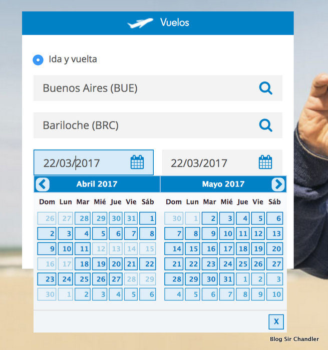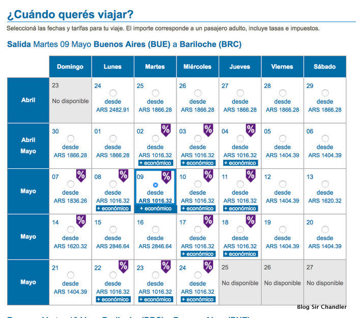 Como suelo hacer pongo el ejemplo de Bariloche… por ser habitué de la ciudad. Busqué fechas de mayo. Los días que tienen promo acá se ven mejor, porque son los que tienen el símbolo de porcentaje (%)