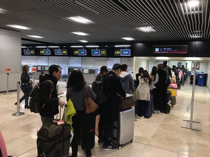 Estuvimos en Madrid del 9 al 13 de Febrero. Como no pudimos hacer el check out del departamento más allá de las 11 de la mañana, y teníamos que estar en el aeropuerto a las 15, y ya veníamos de dar vueltas casi un mes por Europa, cargados, con 7 valijas grandes y mochilas llenas, decidimos ir más temprano al aeropuerto. A las 11 tomamos dos taxis (tarifa fija, 30 euros cada uno), rumbo a Barajas. En el aeropuerto sellamos los tickets de las compras y tiramos los de Blue en el buzón azul, y los de Premier en el amarillo.