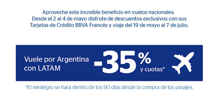 En la página de Latam dice «¡Volá por Argentina con estas ofertas! Aprovechá A volar! LATAM. Comprá hoy mismo tus pasajes en LATAM.com con 35% OFF (*) y en hasta 12 cuotas sin interes con BBVA Francés ó hasta 30% OFF (*) con VISA, tarjetas de credito de todos los bancos. También podés canjear tus KMS. LATAM Pass con hasta 35% OFF.»