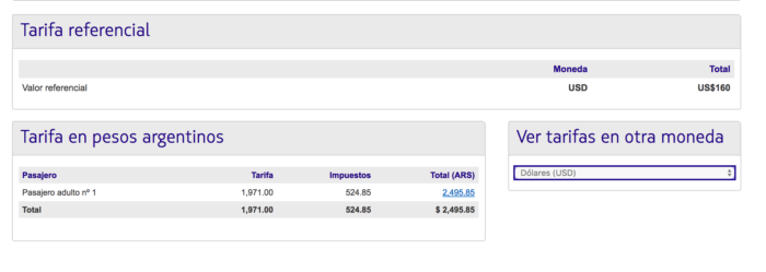 Pero por ejemplo un pasaje a Salta podrían ver cuanto sumarían poniendo el pasaje en dólares para verlo. Lo que son $2.495 se traduce en USD 160. Pero habría que sacarle las tasas que ahí figuran de 524,85 o simplemente usar el valor de 1971 para dividir por 15,6 lo que nos da USD 126.
