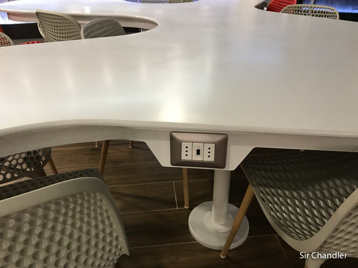 Tiene muchos sillones, cómodos y con enchufes y tomas usb