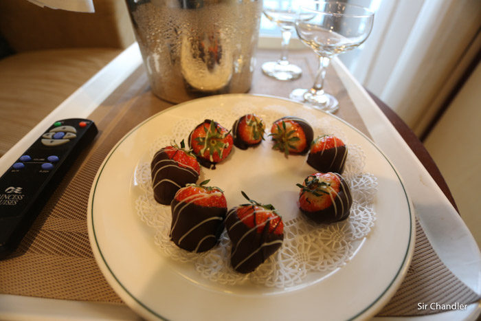 Ah… el detalle al entrar al camarote es que estaban estas frutillas bañadas en chocolate, y un champagne