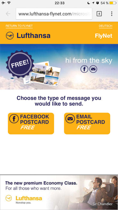 Algo que vi en la página a la cual uno entra para navegar es que está la opción de mandar un mail o facebook post card (??) gratis. Por lo que quizás sea bueno para saludar a alguien desde el aire!