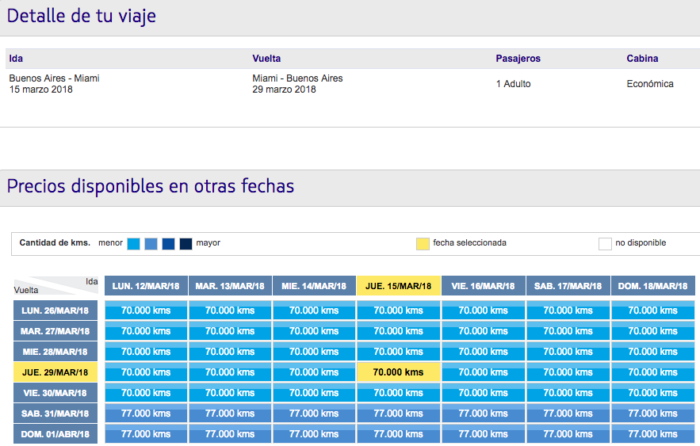 Hola Sir, encuentro que con el descuento me da lo siguiente: 70.000KMS -840.00 Dólares, al cambio de hoy 14532 pesos, oferta web MIAMI 13.300 pesos FINAL. veo que el descuento no es mucho, si le sumamos los impuestos al canjeo del pasaje por KMS. por lo tanto si tu destino es MIA no sirve. muchas gracias igualmente por la info.