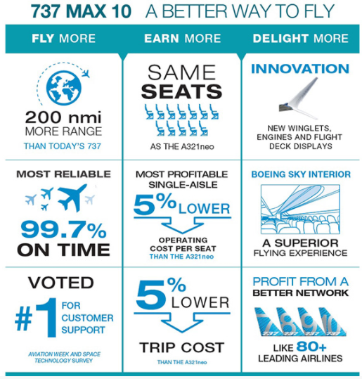 En el cuadro dice que tienen 200 millas naúticas más de alcance que los 737 actuales, que tiene la misma cantidad de asientos que el Airbus 321 NEO y que por asiento cuesta menos
