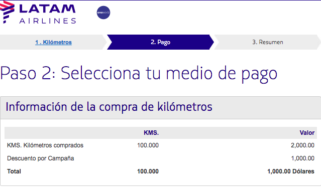 PROMOCIÓN VÁLIDA DEL 07/08/2017 AL 13/08/2017 INCLUSIVE , PROMOCIÓN EXCLUSIVA PARA SOCIOS BBVA-LATAM PASS RESIDENTES EN ARGENTINA. EL DESCUENTO SERÁ DEL 50% TODOS LOS SOCIOS BBVA LATAMPASS, PUDIENDO COMPRAR UN KILÓMETRO A 0,01 USD EN LUGAR DE0,02 USD (DÓLAR ESTADOUNIDENSE). ESTE DESCUENTO SE VERÁ REFLEJADO EN EL PASO 2 DE LA COMPRA. LA COMPRA DE KMS. LATAM PASS NO ES GARANTÍA DE LA DISPONIBILIDAD DE ALGÚN PREMIO LATAM PASS. PRMOCIÓN VÁLIDA ÚNICAMENTE PARA SOCIOS REGISTRADOS EN EL PROGRAMAS ANTES DEL 31 DE JULIO DE 2017 O QUE CUENTES CON UNA SALDO DE KMS IGUAL O SUPERIOR A 1.500 KMS EN SUS CUNETAS .EL NÚMERO DE KILÓMETROS QUE COMPRE NO PUEDE SER INFERIOR A 1.500 KMS. LA CANTIDAD MÁXIMA DE KMS QUE SE PUEDE COMPRAR CONFORME REGLAMENTO LATAM PASS, ES DE 400.000 KMS POR AÑO MOVIL, POR EJEMPLO, SI SE REALIZÓ UNA COMPRA DE 200.000 KMS. EN AGOSTO 2017 Y UNA DE 200.000 KMS EN OCTUBRE 2017, SE ACTUALIZARÁ EL CUPO POR 200.000 KMS EN AGOSTO 2018. LA COMPRA DE KMS. LATAM PASS SE REALIZA VÍA INTERNET EN EL EXTERIOR. POR TAL MOTIVO, EL CARGO A ABONAR SERÁ EN DÓLARES ESTADOUNIDENSES Y LA OPERACIÓN ESTARÁ SUJETA A LAS CONDICIONES VIGENTES EN ARGENTINA PARA LOS GASTOS CON TARJETA DE CRÉDITO EN MONEDA EXTRANJERA. LOS KILÓMETROS COMPRADOS NO SERÁN CONSIDERADOS PARA CLASIFICAR EN LAS DISTINTAS CATEGORÍAS DE SOCIOS LATAM PASS. NO SE PERMITE DEVOLUCIÓN DE LOS KILÓMETROS COMPRADOS, NI APLICA LA GARANTÍA DE 24 HORAS. LA COMPRA DE KILÓMETROS ESTÁ SÓLO DISPONIBLE EN LATAM.COM. SÓLO SE PERMITE UNA COMPRA DE KMS. LATAM PASS AL DÍA. LOS KMS. COMPRADOS TIENEN VIGENCIA DE 3 AÑOS CALENDARIO A PARTIR DE LA FECHA DE LA COMPRA. POR EJEMPLO, SI SU COMPRA DE KMS. FUE REALIZADA EL 10 DE AGOSTO DE 2017, ENTONCES SU VIGENCIA SERÁ HASTA EL 31 DE DICIEMBRE DE 2019. LA COMPRA DE KILÓMETROS NO EXTIENDE EL VENCIMIENTO DE KILÓMETROS ACUMULADOS ANTERIORMENTE. ASEGÚRESE DE TENER REGISTRADO CORRECTAMENTE SU CORREO ELECTRÓNICO ANTES DE CONCRETAR LA COMPRA DE KMS. EL PROGRAMA NO ES ACUMULABRE CON OTROS PROGRAMAS DE SUMA Y ACUMULACIÓN DE PUNTOS. LOS TÉRMINOS Y CONDICIONES DEL PROGRAMA LATAM PASS SON DE EXCLUSIVA PROPIEDAD DE LATAM, LOS MISMOAS SE ENCUENTRAN DISPONIBLES EN SU SITIO WEB www.LATAM.COM, LOS CUALES PODRÁN SER MODIFICADOS. LATAM ES RESPONSABLE POR LA ADMINISTRACIÓN DEL PROGRAMA.