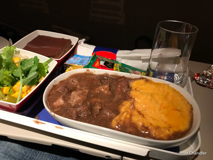 Acá un video más largo, con el aterrizaje también. Se puede notar como hubo turbulencias durante la cena y por eso se cortó el servicio en un par de ocasiones