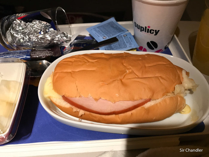 Despegamos y nos dieron el servicio, que era para elegir entre un sandwich de jamón y queso o un muffin de frambuesa
