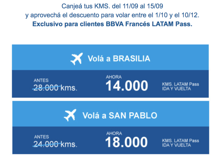 CARTERA DE CONSUMO. PROMOCIÓN EXCLUSIVA PARA CLIENTES TITULARES DE TARJETA DE CREDITO BBVA FRANCÉS LATAM PASS. VALIDO PARA CANJEAR DESDE EL 11/09 AL 15/09 DE 2017. VALIDO PARA VOLAR DESDE BUENOS AIRES ENTRE EL 01/10/2017 Y EL 10/12/2017. SOLO SE APLICARA EL DESCUENTO EN CASO DE SELECCIONAR UN VALOR DE CANJE INICIAL EN EL PASO 1 DE 28.000 KMS. PARA BRASILIA Y DE 24.000 KMS. PARA SAN PABLO. EL DESCUENTO SE VERÁ REFLEJADO AL FINAL DEL PROCESO DE CANJE (PASO 3). CANJE SUJETO A DISPONIBILIDAD DE CLASE Y VUELOS DE ACUERDO A LA CANTIDAD MÁXIMA DE 100 TICKETS DISPUESTA COMO CUPO Y DISTRIBUIDO POR LATAM ENTRE LOS VUELOS Y CABINAS DE LA PROMOCIÓN. EL CLIENTE PUEDE CANJEAR UN PASAJE PARA UN TERCERO PERO DESDE LA CUENTA LATAM PASS ASOCIADA A LA TARJETA DE CREDITO BBVA FRANCÉS LATAM PASS. MÁXIMO 7 PASAJES POR SOCIO. VUELOS OPERADOS POR LATAM. AL COMPRAR O CANJEAR EN OFICINAS DE VENTA LAN Y A TRAVÉS DEL CONTACT CENTER LAN APLICA CARGO POR SERVICIO. EL VALOR DE CANJE COMUNICADO NO INCLUYE TASAS E IMPUESTOS. VALIDO PARA VOLAR EN CABINA ECONOMY. NO PERMITE LA ACUMULACIÓN DE KMS. LATAM PASS. PROMOCIÓN VÁLIDA DE ACUERDO A LOS TÉRMINOS DEL REGLAMENTO LATAM PASS.PARA MAYOR INFORMACIÓN POR FAVOR REVISE LOS TÉRMINOS Y CONDICIONES PUBLICADOS EN EL SITIO WEB WWW.LATAM.COM. EL PROGRAMA NO ES ACUMULABLE CON OTROS PROGRAMAS DE SUMA Y ACUMULACIÓN DE PUNTOS. LOS TÉRMINOS Y CONDICIONES DEL PROGRAMA LATAM PASS SON DE EXCLUSIVA PROPIEDAD Y ADMINISTRADOS POR LATAM, PUEDEN SER MODIFICADOS Y SE ENCUENTRAN DISPONIBLES EN WWW.LATAM.COM.