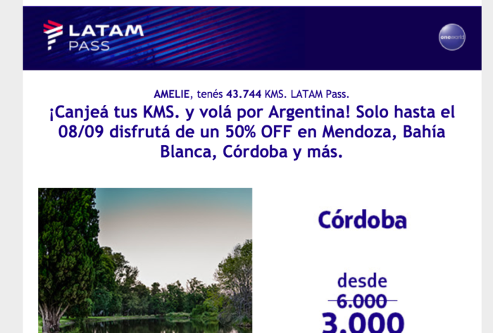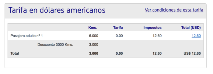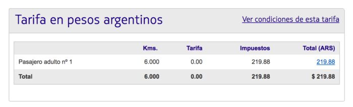 Y el valor que pongo yo es para el caso de los que hayan comprado kilómetros LATAM Pass con la promo del BBVA a 1 centavo por kilómetro… por lo cual es relativo. Si estos clientes no recibieron el mail que habilita la promo, entonces si compraron con la oferta general del primer semestre (mayo?) a 1,2 centavos, se podría decir que si tenés los kilómetros comprados de ese momento el pasaje a Córdoba te costó USD 36 + 220 pesos de tasas, equipaje incluído. Ponele unos $860 TOTAL ida y vuelta…