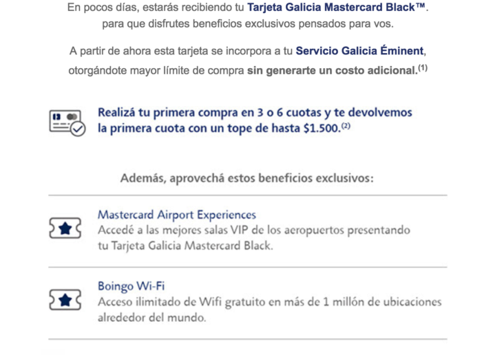 Acabo de recibir en mi domicilio el plastico de AmEx Black de Galicia renovado por 3 años. Tengo tambien la Visa Black, nunca me ofrecieron la Master… Misterios de los bancos argentinos??? Ojala sigan en 2018 los beneficios con con los VIP de aeropuertos! Los dias de estacionamiento gratis son salvadores para los que visimos lejos de CABA