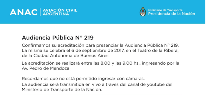 Durante la mañana del miércoles 6 de septiembre se desarrollará la segunda audiencia pública de este gobierno por pedido de nuevas rutas y presentación de nuevas aerolíneas.