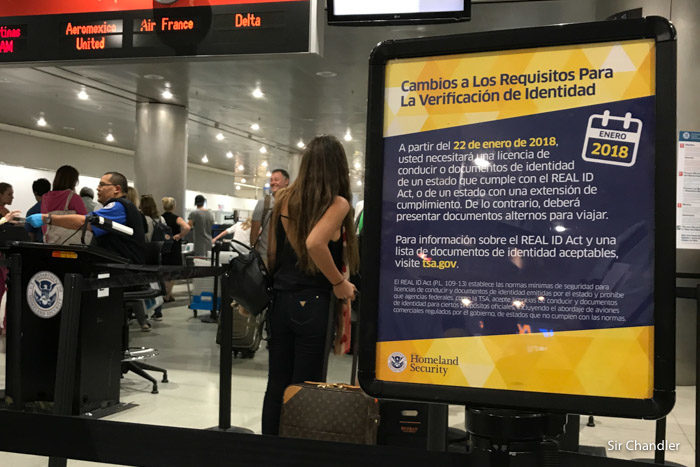 Pasamos rápidamente por los mostradores, donde no había mucha gente y nos fuimos a seguridad. Le saqué esta foto al cartel por si me preguntaban, pero claramente es algo para los norteamericanos que vuelan con licencia de conducir… no para extranjeros con pasaporte