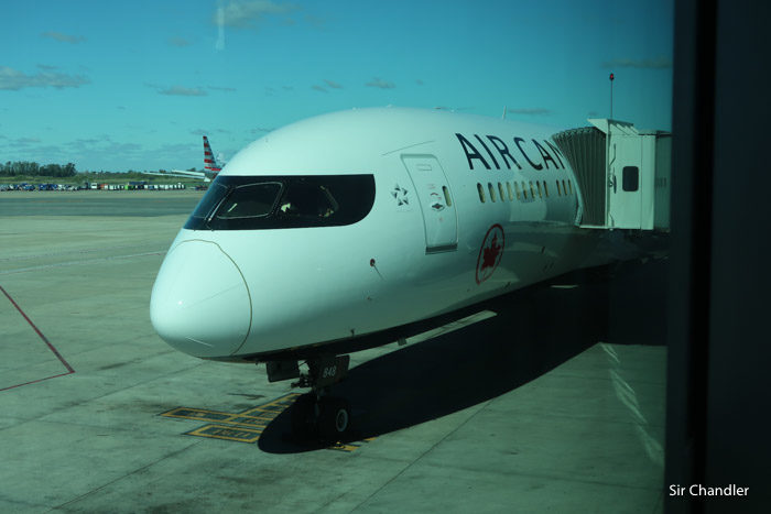 Todo los pasajeros tienen que bajar del avión, sin importar si siguen a Canadá. Hay que pegar la vueltita por seguridad y volver a la puerta. Así se veía el 787 desde la manga