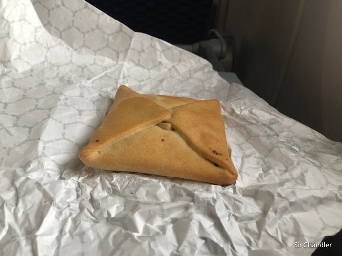 Un rato antes de aterrizar pasaron con un servicio que decían era empanada de carne o sandwich de pavita (si la memoria no me falla…). Esta era la «empanada». Y estaba bien