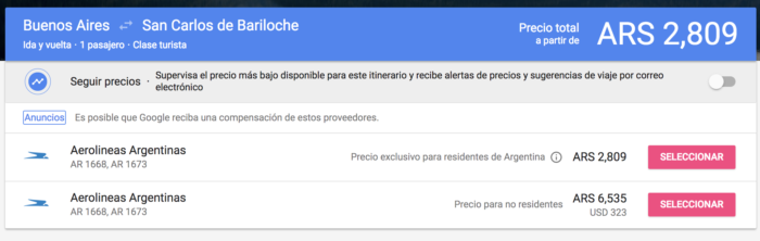 Y lo que mostraba google flights eran los precios internacionales lógicamente. Pero eso cambió hace pocas horas porque sacaron la versión argentina (y chilena entre otros).