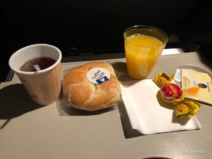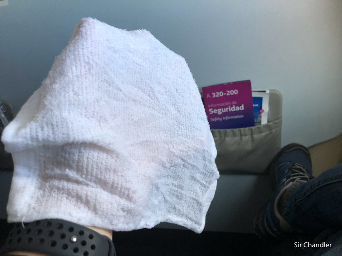 Ya nivelados pasaron con toallas calientes. Esto es Premium Economy que simplemente son los mismos Aribus 320 que se ven en cabotaje, pero que ponen una cortina tras las tres primeras filas y anulan el asiento del medio en cada fila.