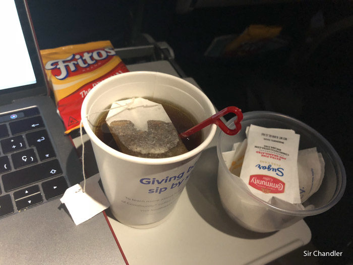 Y gaseosas, te o café son gratis. Destaco también lo que conté en el reporte anterior que los tripulantes pasan anotando por filas lo que uno va a tomar y luego lo traen de a tandas. Sin carritos