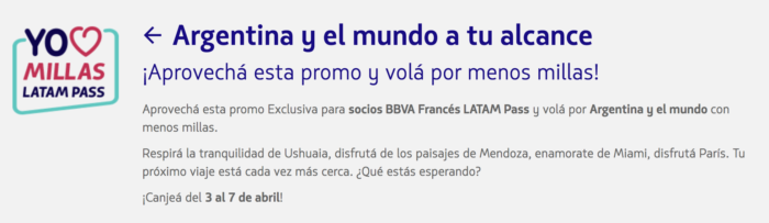 Acá el link de la promo https://www.latam.com/es_ar/promociones/exclusivo-bbva/