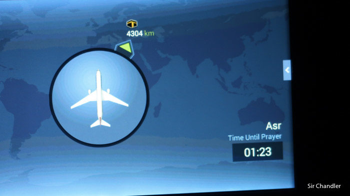 Algo para destacar es que en el sistema de mapa del avión intercalaba la información con distintas pantallas, y una de ellas era cuanto tiempo faltaba para uno de los rezos que hacen los musulmanes practicantes y también hacia donde estaba La Meca