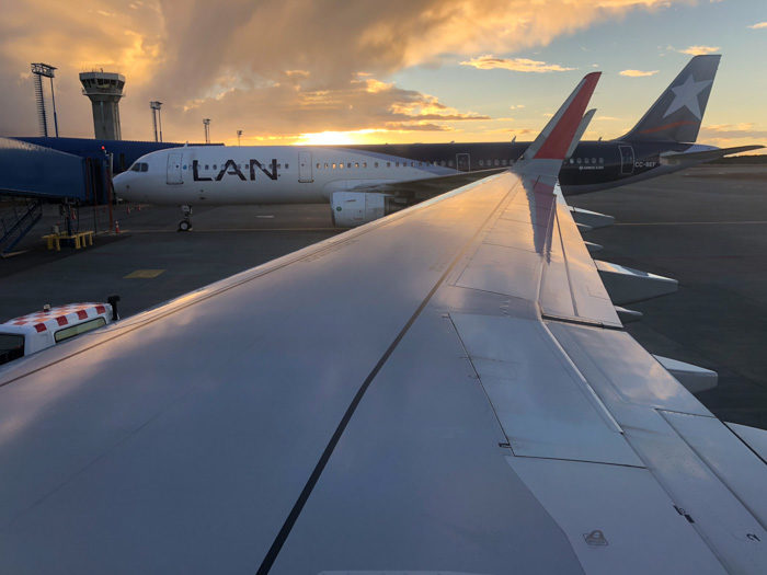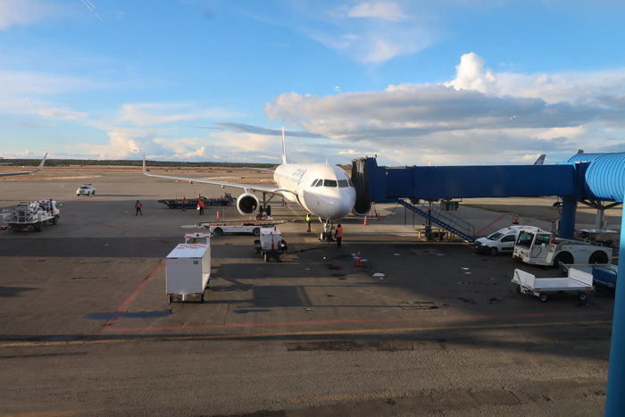 Llegó nuestro Airbus 321, aunque había dos más estacionados que no se movieron en todo mi tiempo en el aeropuerto. Como dato de color había una primera oficial cuando llegó el avión, que se bajó en Punta Arenas, pero volvió a subir otra mujer para el mismo puesto. La primera se verá en el video