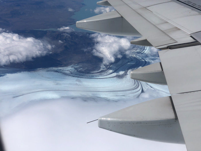 Sir, si mal no veo el glaciar es el Viedma. De norte a sur en la ruta a Punta Arenas pasás primero ese y un poco más adelante está el Perito Moreno (que es más difícil de ver porque la aerovía le pasa muy arriba). En un día despejado esa ruta es hermosa, porque va sobre la frontera entre Argentina y Chile, vas viendo todos los volcanes primero y después los glaciares.