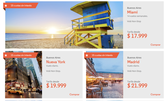 Muy buenas las ofertas de AR o por lo menos es bastante mas barato que Despegar y muchísimo mas barato que Almundo. Recién compre un pasaje de Aep a Sao Paulo por 7500 en 15 cuotas sin interés. No esta nada mal considerando que últimamente un pasaje a SP costaba unos usd400. Todo en baja temporada, por supuesto.