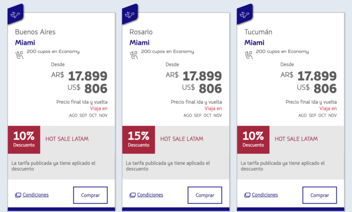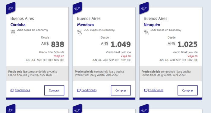 En tanto para la Argentina se promueve el precio base, aunque también canje Latam pass con descuentos, pero en la venta lo muestran por tramo a los precios, con la aclaración de que sólo es para ida y vuelta, en una clara comparación con flybondi que vende por tramos