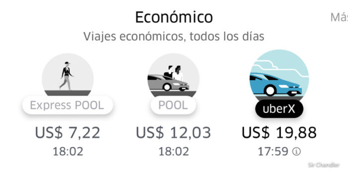 Pero es bueno que se vea la diferencia de precios. La más económica de todas es la Express Pool para este viaje de 8,8 millas o unos 14 kilómetros, con USD 7,22, pasando a la Poll con USD 12,03 y la Uber X con USD 19,88