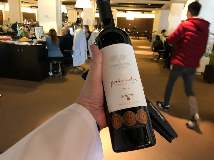 Y en el video se verá que busqué un vino argentino que estaba en la carta de todos los vuelos con business hacia el mundo entero. Verán que la mesa con todas las etiquetas es un imposible… pero lo encontraron y acá está un Norton 2014 😉