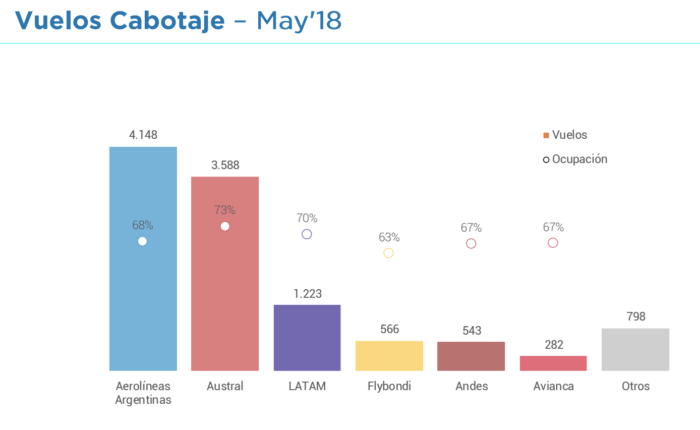 Habría que aclarar que mayo, junio, septiembre y octubre suelen ser los meses de menor cantidad de viajes todos los años (nuestra temporada baja). Que hayan habido más pasajeros en mayo, independientemente del factor de ocupación, es una excelente señal y podría implicar (habría que estudiarlo) que hay gente cambiando el auto y el micro de larga distancia por el avión.