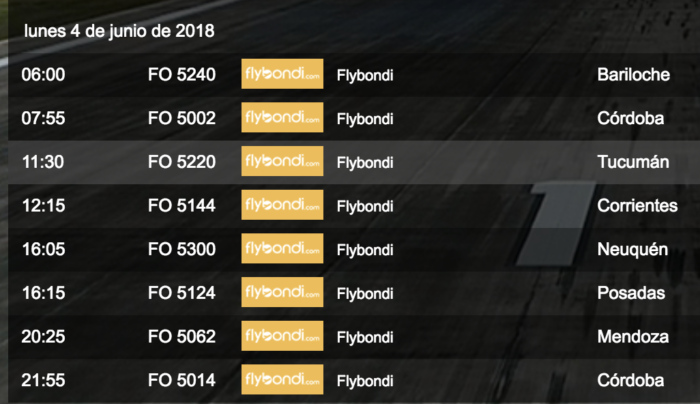 Flybondi ya tiene cuatro aviones y con la llegada del quinto en algunas semanas comenzará a volar a Iguazú (ya lo hacía desde Córdoba) y Salta. Pero hoy por ejemplo tiene ocho salidas programadas