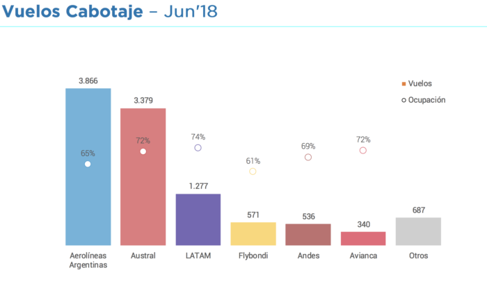 Aerolíneas Argentinas tuvo un 65% de ocupación, Austral un 72%, LATAM la mejor del país con el 74% (sorpresa para muchos), Flybondi un 61% (la única que recién arranca para poder justificarla), Andes el 69% (mejor que AR!) y Avianca empatando a Austral con un 72%