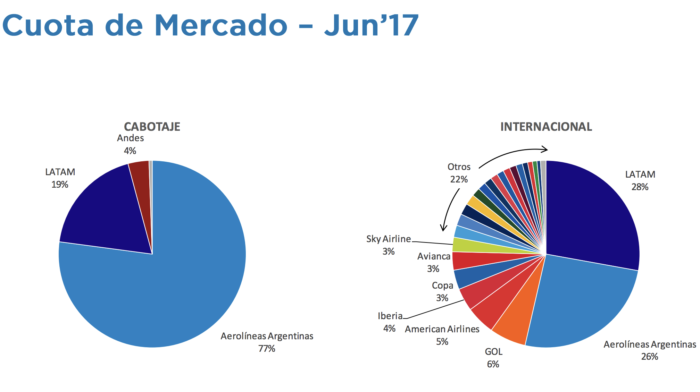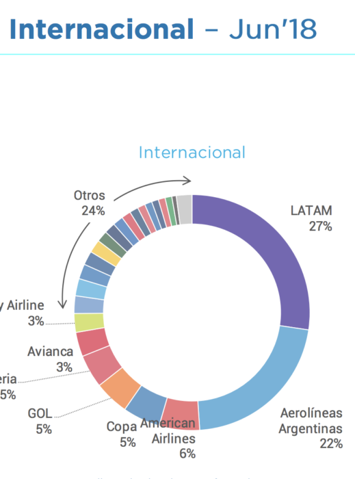 El que creció fue COPA que tiene el 5% y el año pasado era el 3%. Gol bajó un punto e Iberia y American mejoraron un punto cada una. Aerolíneas perdió cuatro puntos, pero por no haber sumado vuelos como las otras, por eso cambió la torta con la ampliación de más vuelos disponibles.