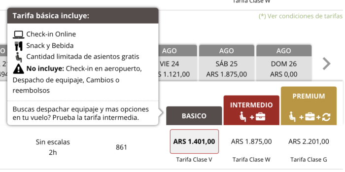 O Andes que tiene las tres tarifas, sin equipaje (despachado, si de mano), o con equipaje o la chance de meter cambios