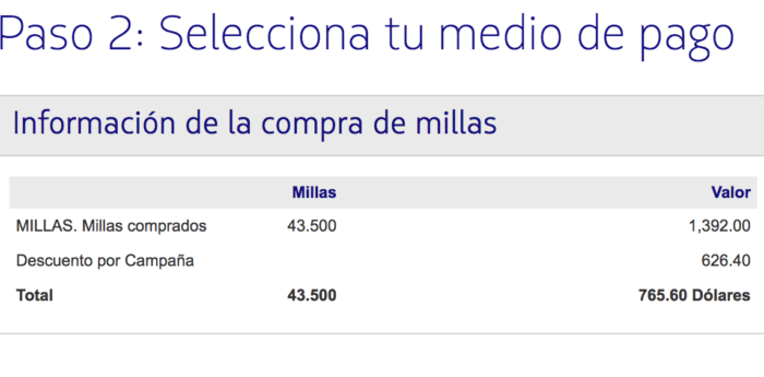 Tienen que ver el descuento de millas en el PASO 2, de esta manera. Y pongo como ejemplo el total del pasaje a Estados Unidos